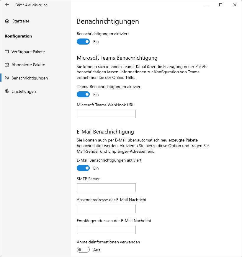 Sobald der Package Subscription Service eine neue Version einer abonnierten Applikation erkennt, wird er diese herunterladen und daraus ein Packaging PowerBench-Paket erzeugen. Damit Sie nicht manuell prüfen müssen, ob neue Pakete erstellt wurden, können Sie sich automatisch benachrichtigen lassen, sobald die Pakete verfügbar sind. Dafür stehen Ihnen die Optionen "Microsoft Teams" und E-Mail zur Verfügung.