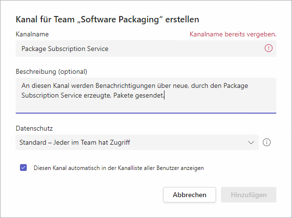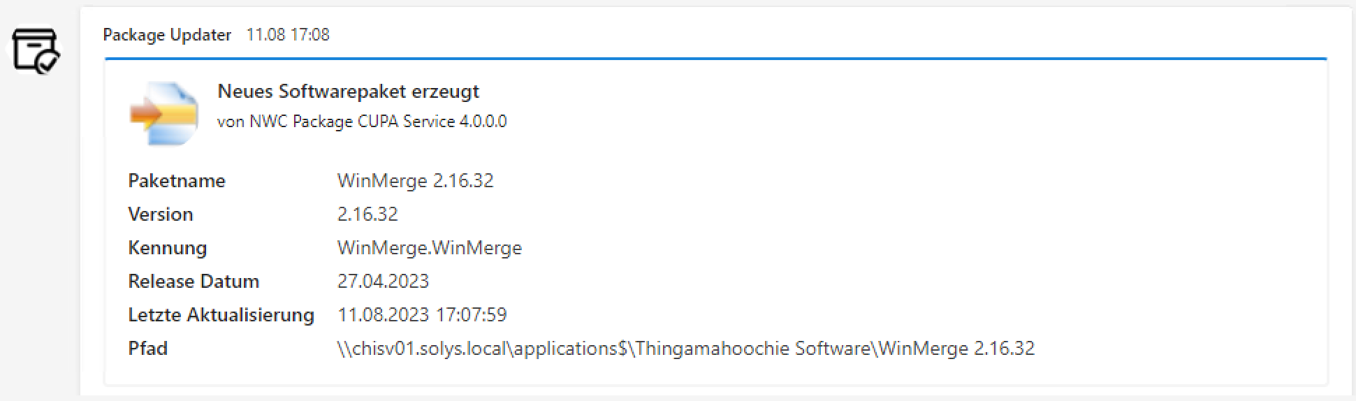 Die Integration von Microsoft Teams und dem Package Subscription Service ist damit abgeschlossen. Sobald der Dienst ein neues Paket erzeugt hat, wird eine neue Benachrichtigung erzeugt, in der Sie über das neue Paket mit Paketnamen, Version, der spezifischen Applikations-Kennung, sofern vorhandem dem Release-Datum, der letzten Aktualisierung und dem Pfad zum Paketverzeichnis informiert werden.