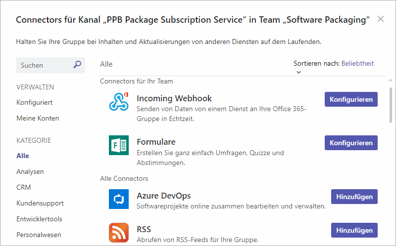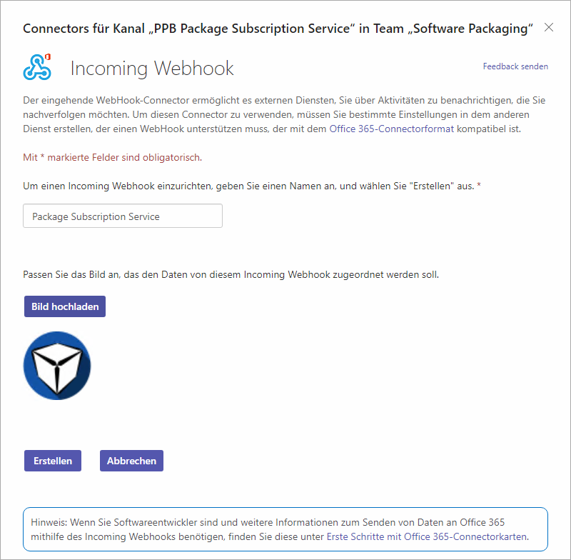 Um Benachrichtigungen über neue Pakete innerhalb eines Teams-Kanals zu erhalten, müssen Sie die Integration des Package Subscription Service in Ihre Teams-Umgebung konfigurieren. Die Integration erfolgt über einen sogenannten Webhook, der wie folgt beschrieben eingerichtet wird.