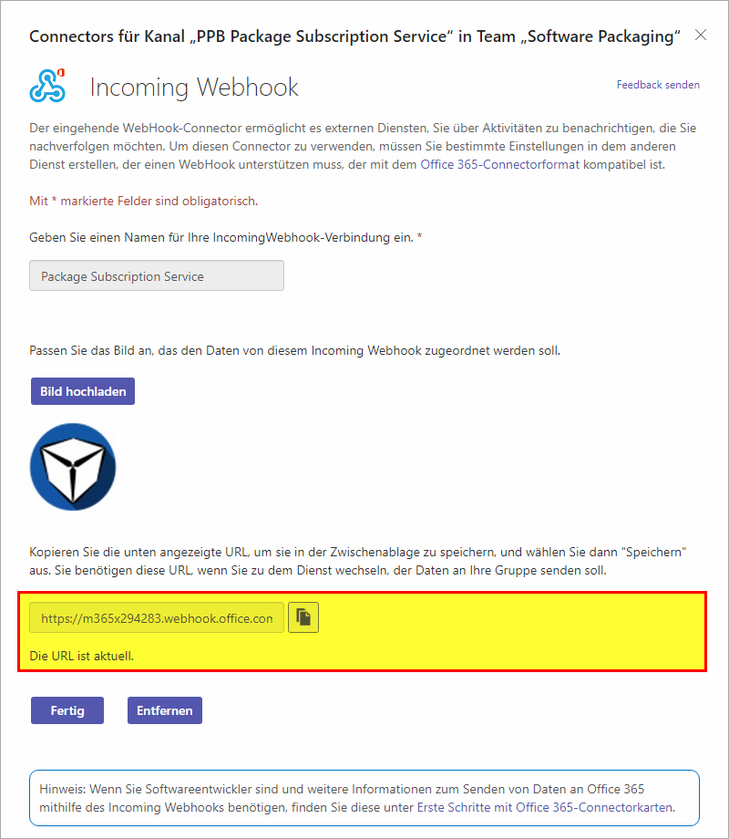 Schließlich kopieren Sie die erzeugte URL in die Zwischenablage und fügen diese im Feld "Microsoft Teams WebHook URL" ein. Beenden Sie die Konfiguration über den "Fertig"-Button.