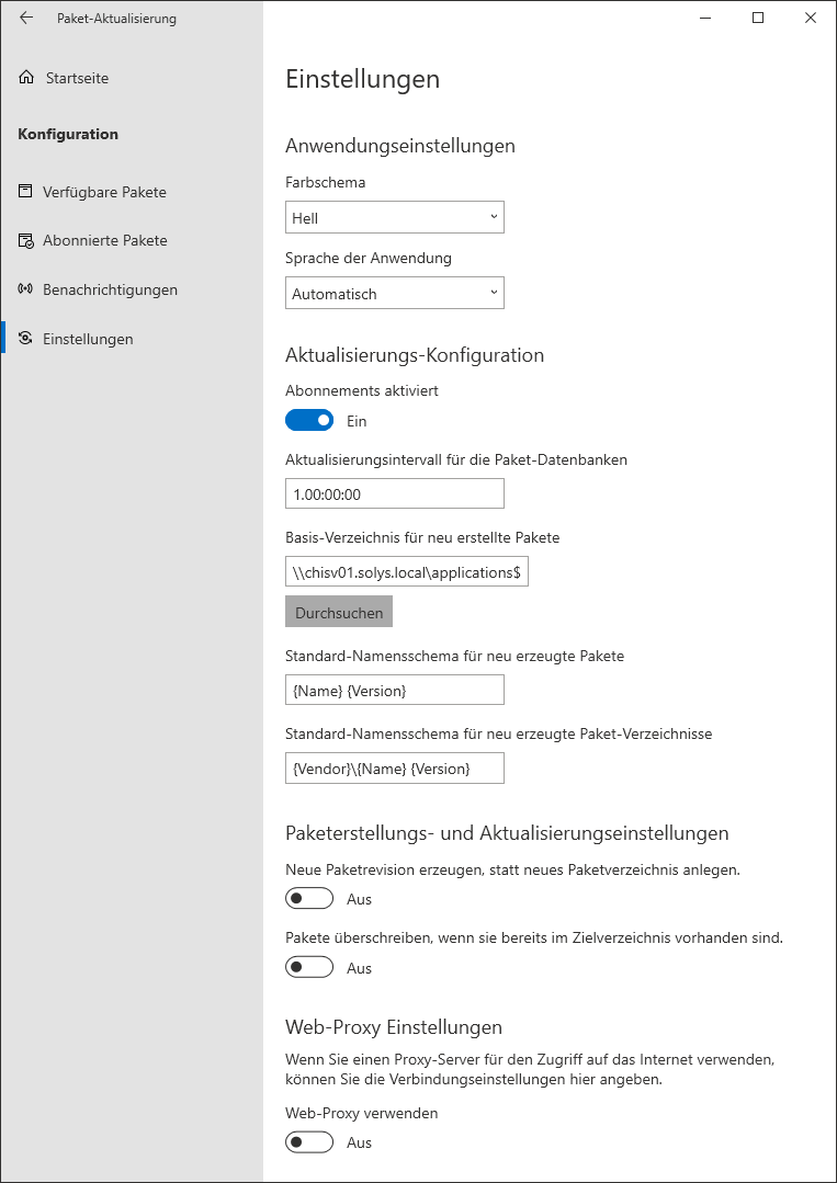 Legt das Intervall fest, in dem der Dienst die Liste der Applikationen in den Paket-Datenbanken - in der Version 4.0 wird das Winget-Repository unterstützt - aktualisiert. Geben Sie das Intervall im Format <Tage>.<Stunden>:<Minuten>:<Sekunden> ein. Der Standardwert für das Aktualisierungsintervall beträgt 24 Stunden. - Basis-Verzeichnis für neu erstellte Pakete
