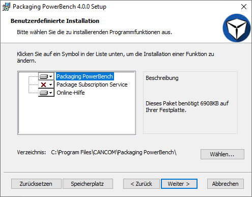 Bei der Standard-Installation werden die Funktionen "Packaging PowerBench" und "Online-Hilfe" installiert, bestehend aus den Kernkomponenten, den enthaltenen Dokumentationen und den zugehörigen Verknüpfungen im Startmenü und auf dem Desktop. Die Komponente "Package Subscription Service" wird im Rahmen der Standard-Installation nicht installiert, da diese in der Regel nicht auf einem Paketierungs-Arbeitsplatz, sondern auf einem Server eingerichtet wird. Bei der vollständigen Installation werden alle Features installiert, auch der Package Subscription Service.