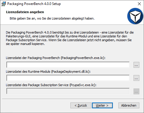 Falls Sie noch keine Lizenzdateien erhalten haben, können Sie diesen Schritt auch überspringen, indem Sie die Eingabefelder leer lassen und mit "Weiter >" zum nächsten Schritt übergehen. Sie müssen die Lizenzdateien dann jedoch später manuell kopieren. In diesem Fall müssen die Dateien "PackagingPowerBench.exe.lic" und "PcupaSvc.exe.lic" direkt in das Installationsverzeichnis – standardmäßig "%ProgramFiles%\CANCOM\Packaging PowerBench" – und die Datei "PackageDeployment.dll.lic" in das Unterverzeichnis "Common Runtime Files" des Installationsverzeichnisses kopiert werden.