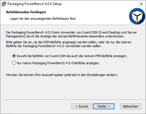 In diesem Schritt geben Sie an, ob Sie die aus Ivanti DSM bekannten Befehlsnamen angezeigt bekommen möchten. Diese sind als Aliase für die nativen Packaging PowerBench Befehle angelegt, um Ihnen den Umstieg von DSM auf die PPB so einfach und so komfortabel wie möglich zu machen. Wenn Sie bisher nicht mit DSM gearbeitet haben, wählen Sie am besten die zweite Option. Sie können Ihre Wahl aber selbstverständlich später jederzeit in den Einstellungsoptionen der PPB anpassen. Bestätigen Sie Ihre Auswahl mit "Weiter >".