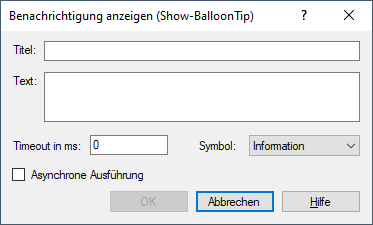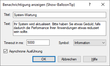 Zeigt eine Benachrichtigung mit einem beliebigen Titel und einer beliebigen Nachricht im Infobereich der Taskleiste an. In den Optionen legen Sie fest wie lange die Benachrichtigung angezeigt werden soll, ob ein Icon angezeigt werden soll und ob auf die Ausführung gewartet werden soll.