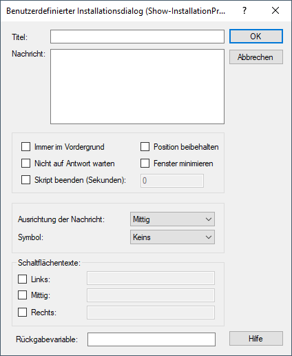 Text, der in der Titelzeile des Meldungsfensters angezeigt wird. Wenn kein Titel angegeben ist, wird der Name des Paketes verwendet. Möchten Sie eine Meldung ohne Titeltext anzeigen, geben Sie hier ein Leerzeichen ein. - Nachricht