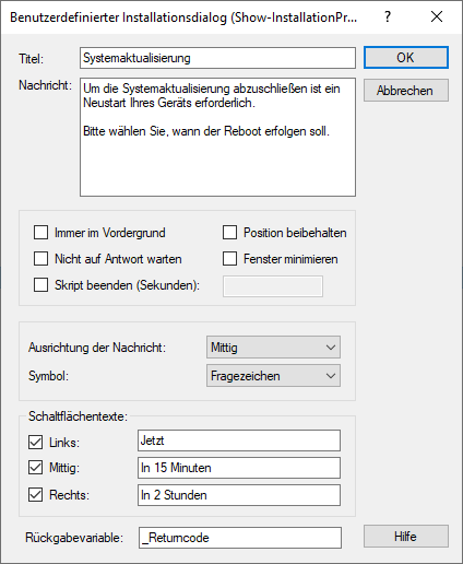 Das nachfolgende Beispiel erzeugt ein Meldungsfenster, um den Anwender nach erfolgreicher Systemaktualisierung nach dem gewünschten Zeitpunkt für einen Neustart zu fragen. Die Auswahl des Anwenders wird zur weiteren Verwendung in der Variable _Returncode gespeichert.