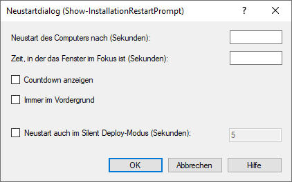 Erzeugt einen Neustartdialog mit einem Countdown bis zum erzwungenen Neustart an. In den Optionen legen Sie die Zeit bis zum Neustart fest und entscheiden, ob diese in Form eines Countdown angezeigt wird. Weiterhin definieren Sie das Verhalten des Dialoges und aktivieren bei Bedarf die Unterstützung des Befehls im nicht-interaktivem Modus.