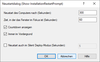 Das nachfolgende Beispiel erstellt einen Neustartdialog mit einem Countdown von 300 Sekunden. Der Dialog wird dabei im Vordergrund angezeigt und kann 60 Sekunden vor dem Neustart nicht mehr minimiert werden.