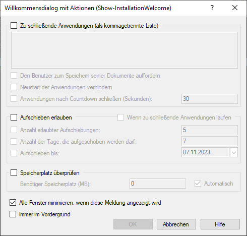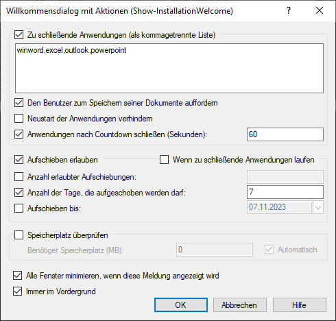 Erzeugt einen Willkommensdialog, der den Benutzer mit Informationen über die anstehende Installationen und Aktionen, die vor Beginn der Installation durchgeführt werden müssen, versorgt. In den Optionen definieren Sie zu schließende Applikationen und entscheiden, wie sich diese beim und nach dem Schließen verhalten sollen. Weiterhin legen Sie fest ob, ein Aufschub der Installation für eine bestimmte Anzahl von Versuchen, Tagen oder bis zu einem bestimmten Enddatum möglich ist.