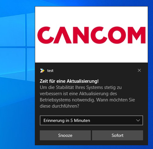 Das nachfolgende Beispiel erstellt eine Toast-Benachrichtigung mit Informationen zu einer anstehenden Aktualisierung des Systems bei der der Benutzer entscheiden kann, ob die Aktualisierung sofort durchgeführt wird oder eine Erinnerung nach einer bestimmten Zeit erfolgen soll.