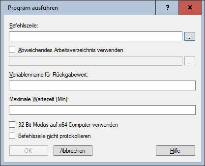 Führt ein Kommandozeilen- oder Windows-Programm aus. Das Ergebnis wird über eine Variable ausgegeben und kann dann weiterverwendet werden.