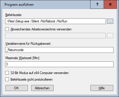 Das folgende Beispiel ruft ein Setup-Programm auf, auf das maximal 3 Minuten gewartet wird. Der Rückgabewert wird in der Variablen _Returncode gespeichert: