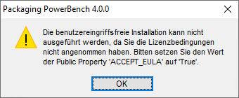 - Wenn Sie die ACCEPT_EULA-Property nicht setzen, bricht die Installation mit der folgenden Fehlermeldung ab: