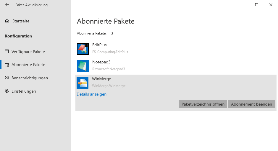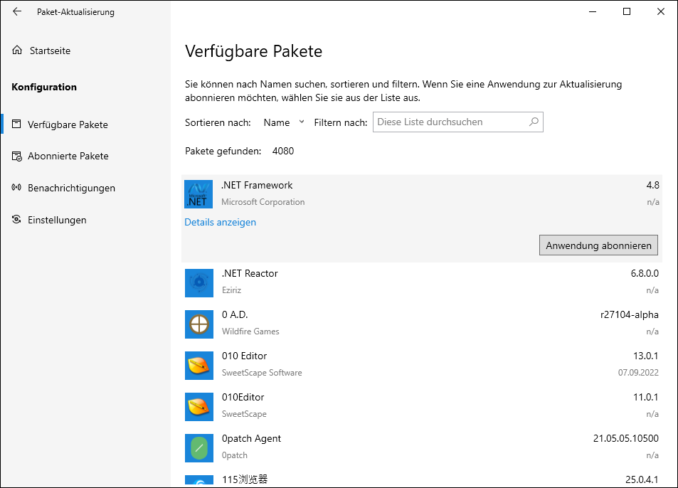 Um die Liste der abonnierbaren Pakete einzusehen, klicken Sie auf den Schaltfläche "Verfügbare Pakete". Sie sehen daraufhin eine Liste aller im Winget-Repository enthaltenen Pakete.