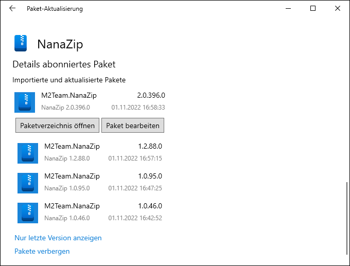 In dieser Ansicht können Sie das Paketverzeichnis einer bestimmte Paketversion über die "Paketverzeichnis öffnen"-Schaltfläche direkt im Explorer öffnen. Sollte die Packaging PowerBench GUI ebenfalls auf dem System installiert sein, können Sie das Paket per "Paket bearbeiten" auch direkt dort öffnen. Der Link "Nur letzte Version anzeigen" blendet alle Paketversionen bis auf die Neueste aus, "Pakete verbergen" ist das Gegenteil vom oben beschriebenen "Pakete anzeigen" und blendet alle Pakete wieder aus.