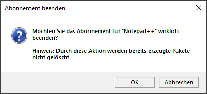 Wenn Sie das Abonnement einer Applikation beenden möchten, wählen Sie in den Abonnement-Einstellungen die Schaltfläche "Abonnement beenden". Sie werden dann mit der folgenden Messagebox informiert, dass durch diese Aktion bereits erzeugte Pakete nicht gelöscht werden, sondern nur zukünftig keine neuen Pakete mehr erzeugt werden. Bestätigten Sie gegebenenfalls diesen Hinweis, um das Abonnement wirklich zu beenden oder brechen Sie die Aktion über den "Abbrechen"-Button ab.