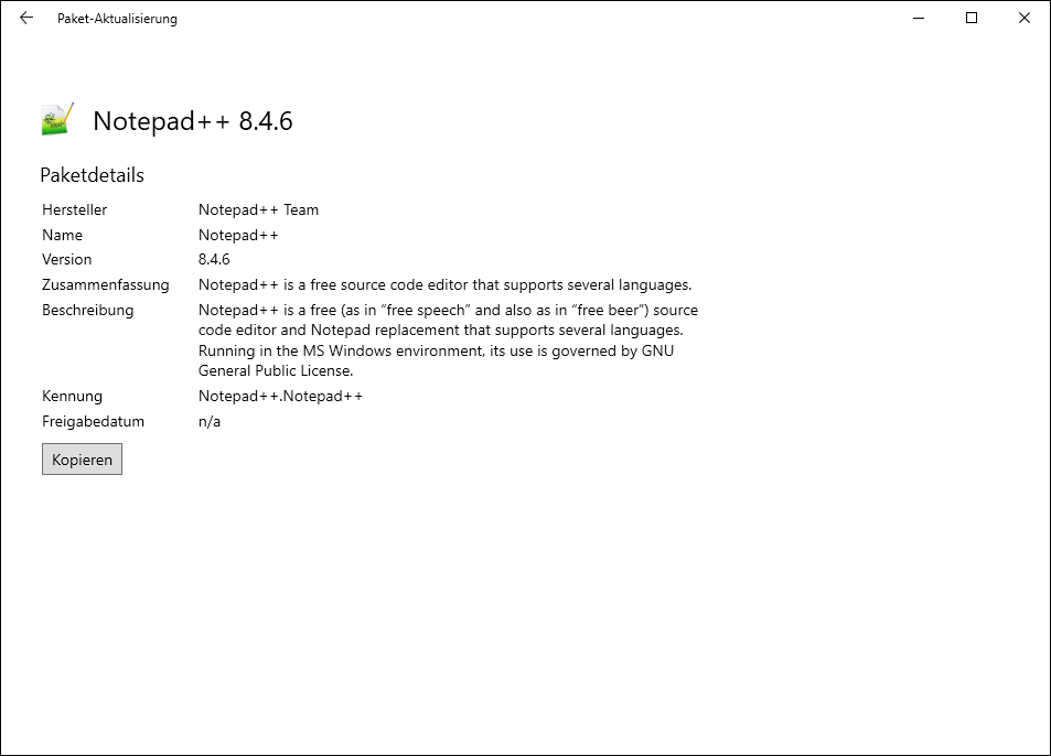 Wenn Sie eine Applikation gefunden haben, können Sie deren Detail-Informationen über den Link "Details anzeigen" einsehen. Dabei werden Ihnen die in Winget verfügbaren Informationen zu Hersteller, Name, Version, Zusammenfassung, Beschreibung, Kennung und Freigabedatum angezeigt. Über die "Kopieren"-Schaltfläche können Sie diese Informationen in die Zwischenablage kopieren. Über den 🡨 Button in der Titelzeilen kommen Sie zur Gesamtliste zurück.