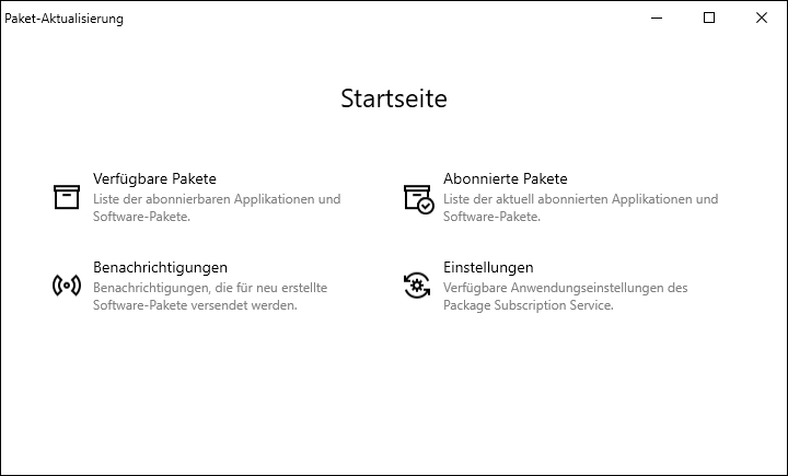 Um die GUI zu starten, verwenden Sie die Verknüpfung "Package Subscription Service" aus dem Startmenü oder rufen sie das Executable "PcupaSvc.exe" aus dem Installationsverzeichnis ohne weitere Parameter auf. Zunächst öffnet sich die Startseite, von der aus Sie auf die einzelnen Untermenüs zugreifen können.