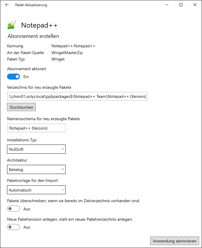Auch hier wird die Vorgabe für den Benamung der erzeugten Pakete aus der Konfiguration übernommen, kann jedoch individuell für dieses Abonnement angepasst werden. - Installations-Typ