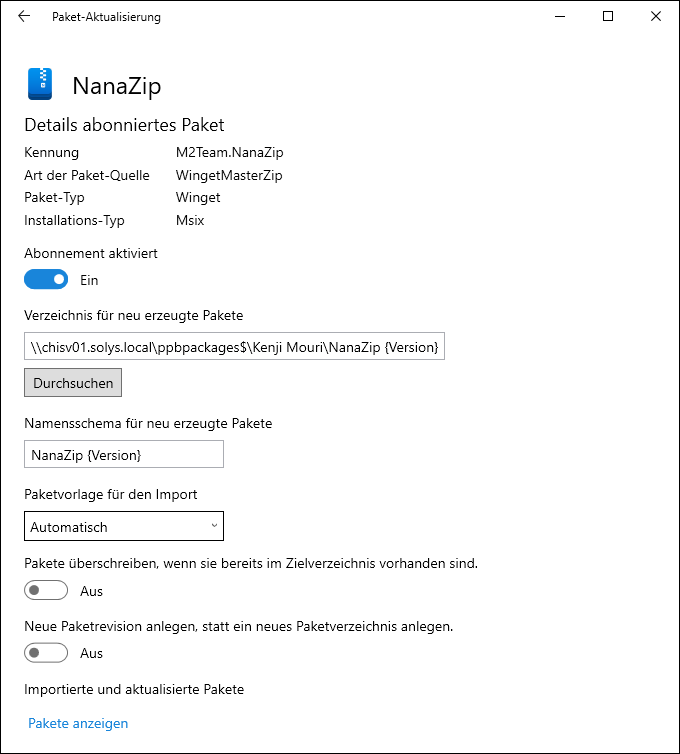 Neben den Einstellungen des Abonnements sehen Sie in dieser Ansicht auch, falls der Package Subscription Service bereits ein oder mehrere Pakete für die Applikation erzeugt hat. Unterhalb von "Importierte und aktualisierte Pakete" können Sie auf "Pakete anzeigen" klicken, um die vorhandenen Pakete anzeigen zu lassen.