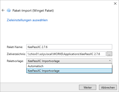 Die folgenden Screenshots zeigen die Auswahlmöglichkeit am Beispiel eines benutzerdefinierten Import-Templates für die Anwendung KeepassXC sowohl beim manuellen Import...