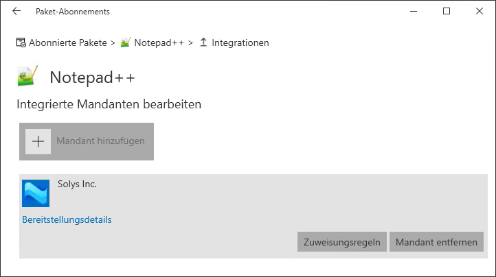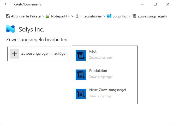 Um abonnierte Pakete in den zugeordneten Mandanten auch automatisch zuzuweisen, markieren Sie den Mandanten für den die Zuweisungsregeln festgelegt werden sollen und drücken die Schaltfläche "Zuweisungsregeln". Auf dieser Seite verwalten Sie, wie die aktuelle bearbeitete abonnierte Applikation in dem aktuell ausgewählten Mandanten bereitgestellt wird.