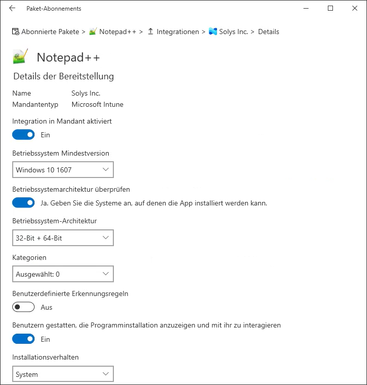Wenn "Betriebssystemarchitektur überprüfen" auf "Ja" gesetzt wird, geben Sie in dieser Einstellung an, auf welchen Plattformen das Paket ausgeführt werden darf. Mögliche Werte sind "32-Bit", "64-Bit" und "ARM 64-Bit". - Kategorien