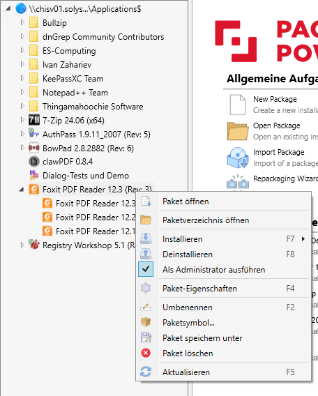 - Eine neue, mit der PPB-Version 4.0 eingeführte Option, ein Paket zu öffnen, besteht in der Paketliste im linken Bereich des Fensters. Dort sehen Sie alle konfigurierten Paketpfade und die darin befindlichen Pakete. Öffnen Sie das gewünschte Paket einfach mit dem entsprechenden Menüpunkt aus dem Kontextmenü.