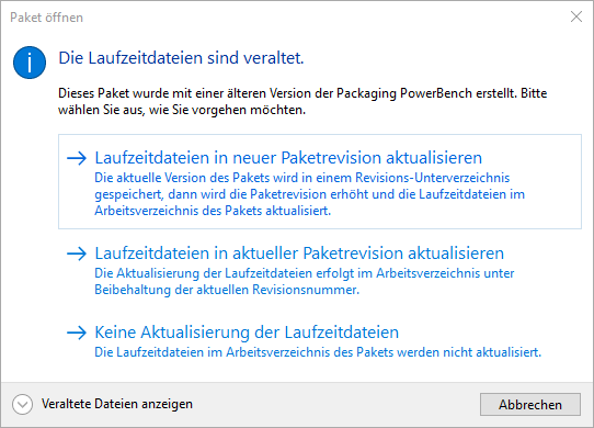 Wenn Sie ein Paket öffnen, das mit einer älteren Version der PPB erstellt wurde, erhalten Sie einen Dialog, der abfragt, wie Sie mit dem Paket weiter verfahren möchten: