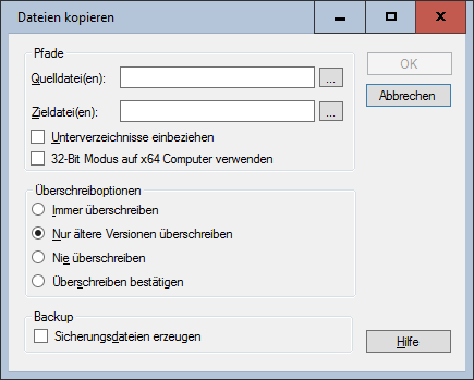 Legt fest, ob auch Dateien in Unterverzeichnissen kopiert werden sollen. Dies ist insbesondere bei Verwendung von Wildcards relevant. - 32-Bit Modus auf x64 Computer verwenden