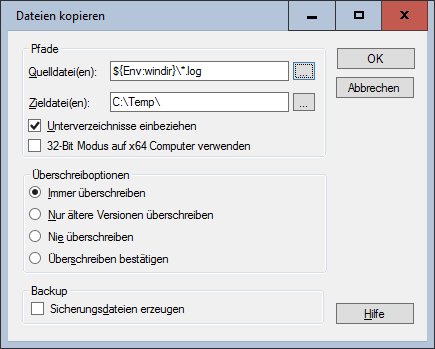 Dieser Befehl kopiert eine oder mehrere Dateien von einem Quell- in das Zielverzeichnis. Die Arbeitsweise sowie die verwendbare Syntax entsprechen dem Windows Shell-Befehl COPY (Verwendung von Platzhaltern und Umgebungsvariablen). Zusätzlich können beliebige Variablen wie verwendet werden.
