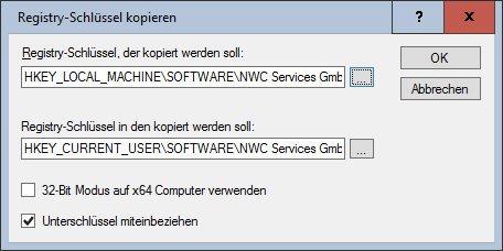 Das folgende Beispiel kopiert alle Werte und Unterschlüssel unterhalb von SOFTWARE\NWC Services GmbH\Package Deployment aus dem LOCAL_MACHINE-Bereich in den CURRENT_USER-Bereich.