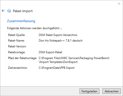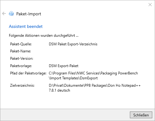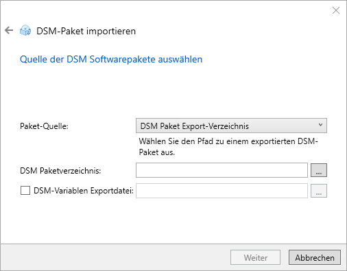 Im "DSM Paketverzeichnis"-Feld wird der UNC-Pfad zum ausgewählten Paket eingetragen. Bestätigen Sie Ihre Auswahl mit "Weiter" - Die weiteren Schritte entsprechen wieder dem oben beschriebenen Import eines vorab exportierten DSM-Pakets, sodass sie an dieser Stelle nicht wiederholt werden. Schließen Sie den Import wie gewünscht ab.