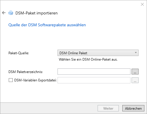- Auf der "DSM-Paket importieren"-Seite des Assistenten wählen Sie als Paket-Quelle die Option "DSM Online Paket".