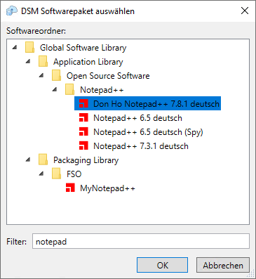 Über die "..."-Schaltfläche neben "DSM Paketverzeichnis" können Sie den Paket-Auswahldialog anzeigen, der Ihnen die Global Software Library Ihrer angebundenen DSM-Umgebung anzeigt. Wählen Sie nun aus diesem Dialog das zu importierende Paket aus. Sie können die Menge der angezeigten Pakete filtern, indem Sie einen Teil des Paketnamens im "Filter"-Feld eintragen. Bestätigen Sie Ihre Auswahl mit OK.