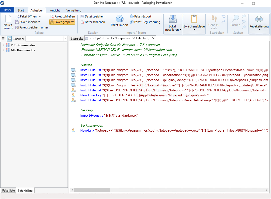 Das Script wird im Anschluss analysiert und es wird versucht, möglichst viele Kommandos in die entsprechenden PowerShell-Kommandos zu konvertieren. Ein typisches per NetInstall-Spy erstelltes Paket sieht nach dem Import und der Konvertierung beispielsweise so aus: