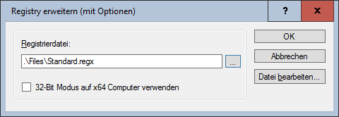 Gibt die in die .reg- oder .regx-Datei inklusive Pfad an. Dabei sind Variablen erlaubt. Wählen Sie über die "..."-Schaltfläche eine (auf dem Paketiersystem) bestehende Datei aus oder geben Sie den Pfad manuell an. Sie können auch eine neue .reg- oder .regx-Datei erzeugen, indem Sie den Namen manuell angeben und dann auf "Datei bearbeiten..." klicken.
