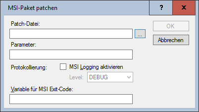 Gibt den zu installierenden Windows Installer Patch (*.msp-Datei) inklusive Pfad an. Wählen Sie über die "..."-Schaltfläche eine (auf dem Paketiersystem) bestehende Datei aus oder geben Sie den Pfad manuell an. - Parameter