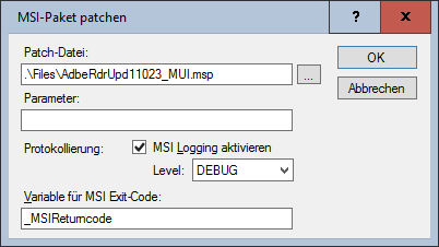 Das untenstehende Beispiel installiert den im Files-Unterverzeichnis des Paketverzeichnisses abgelegten Patch für den Adobe Reader. Dabei wird detailliertes Windows Installer Logging eingeschaltet und der Returncode des Windows Installers in der Variablen _MSIReturncode zur Auswertung im weiteren Scriptverlauf gespeichert.