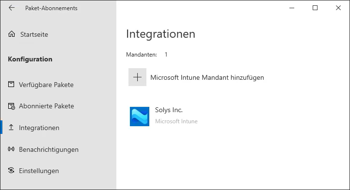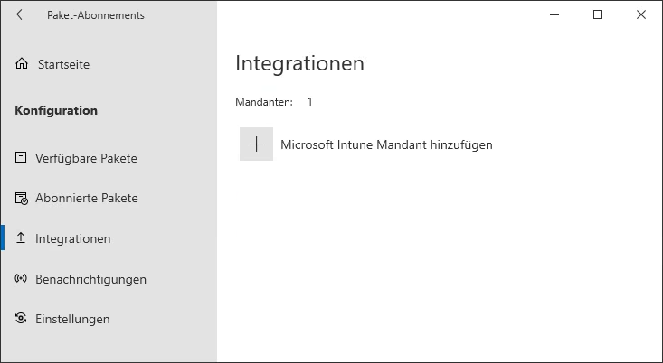 Um diese Möglichkeit der automatisierten Bereitstellung von Paketen zu verwenden, müssen Sie zunächst den oder die benötigen Intune Mandanten konfigurieren. Wählen Sie dazu auf der Startseite den Unterpunkt "Integrationen". Fügen Sie dann durch Klicken auf den "Microsoft Intune Mandant hinzufügen"-Button eine neue Integration hinzu.
