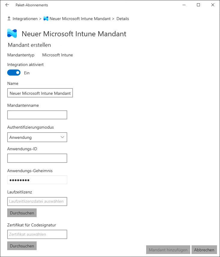 Wenn Sie diese Einstellung leer lassen, wird die Laufzeitlizenz aus dem Verzeichnis "Common Runtime Files" in die Intune-Pakete integriert. Dies ist der Standardfall, wenn Sie nur eine Intune-Integration verwenden. Wenn Sie jedoch mehrere Intune-Mandanten mit individuellen Runtime-Lizenzen verwalten möchten, geben Sie hier die Laufzeitlizenz für diesen Mandanten an. Wenn mehrere Laufzeitlizenzen für verschiedene Mandanten zu Einsatz kommen, wird empfohlen, die Laufzeitlizenzen auf einer zentralen Freigabe bereitzustellen und hier darauf zu verweisen. Wenn Sie über den "Durchsuchen"-Button eine Laufzeitlizenz auswählen, wird der Inhalt in Ihre individuelle Konfiguration importiert und steht auch ohne Zugriff auf die eigentliche Lizenzdatei zur Verfügung. - Zertifikat für Codesignatur
