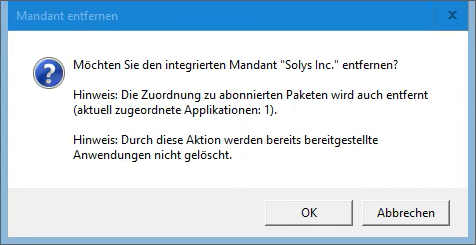 Wenn Sie einen Mandanten entfernen möchten, markieren Sie diesen in der Liste der verfügbaren Integrationen und drücken Sie die Schaltfläche "Mandant entfernen". Sie werden dann mit der folgenden Messagebox informiert, dass durch diese Aktion auch die bestehenden Zuordnungen abonnierter Pakete zu diesem Mandanten entfernt werden, bereits erzeugte und gegebenenfalls bereitgestellte Pakete aber nicht gelöscht werden. Bestätigten Sie gegebenenfalls diesen Hinweis, um die Integration wirklich zu entfernen oder brechen Sie die Aktion über den "Abbrechen"-Button ab.