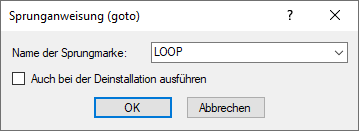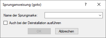 Name der Sprungmarke, an der die Scriptausführung fortgesetzt werden soll. Sie können eine existierende Sprungmarke aus der Dropdown-Liste auswählen oder den Namen der Sprungmarke manuell eintragen. Die spezielle Sprungmarke $$BeginUninstallScript ist stets vorhanden. - Auch bei der Deinstallation ausführen