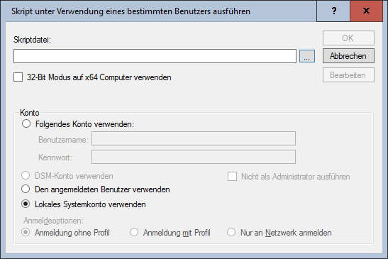 Wenn das Script unter einem definierten Benutzerkonto ausgeführt werden soll, legt diese Option fest, wie mit dem Profil des Konto verfahren wird. - Anmeldung ohne Profil