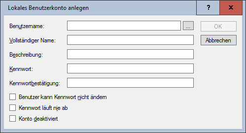 Der Name des Benutzerkontos. Ein Benutzername darf mit keinem anderen Benutzer- oder Gruppennamen des aktuell verwalteten Computers übereinstimmen. Er kann bis zu 20 Zeichen in Groß- oder Kleinschreibung mit Ausnahme der folgenden enthalten: " / \ [ ] : ; | = , + * ? < > - Vollständiger Name