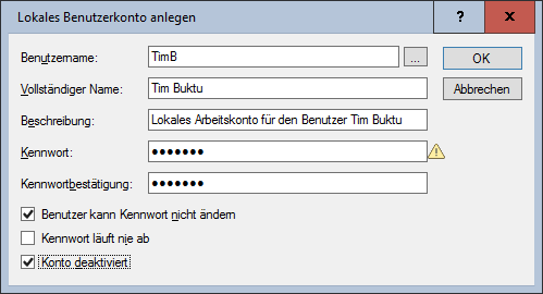 In diesem Beispiel wird der lokale Benutzer "TimB" angelegt und die Eigenschaften gesetzt: