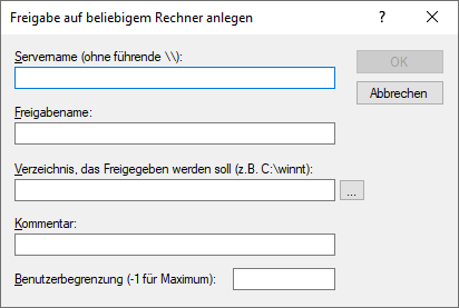 Legt eine neue Dateisystem-Freigabe an. Die Freigabe kann dabei auf dem lokalen oder einem entfernten Computer erzeugt werden.