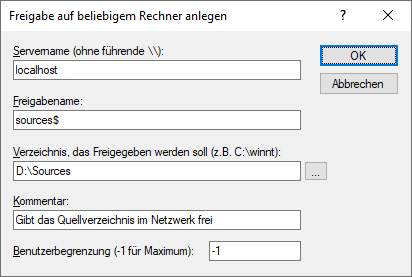 Im folgenden Beispiel wird das lokale Verzeichnis D:\Sources auf dem Rechner, auf dem der Befehl ausgeführt wird, unter dem Namen sources$ freigegeben.