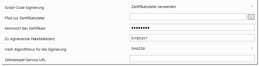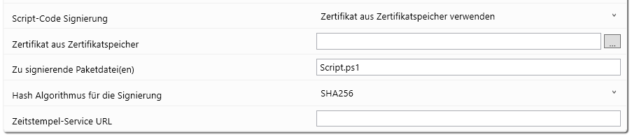 Standardmäßig werden beim Aktivieren der Paket-Signierung nur das Paket-Script Script.ps1 selbst signiert. Wenn Sie aber weitere Paket-Dateien signieren möchten, beispielsweise von Hilfs-Scripts, die Sie im SupportFiles-Ordner abgelegt haben, können Sie diese in dieser Einstellung durch Kommata getrennt angeben. - Hash-Algorithmus für die Signierung